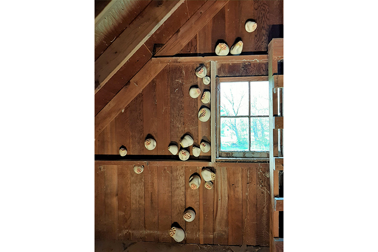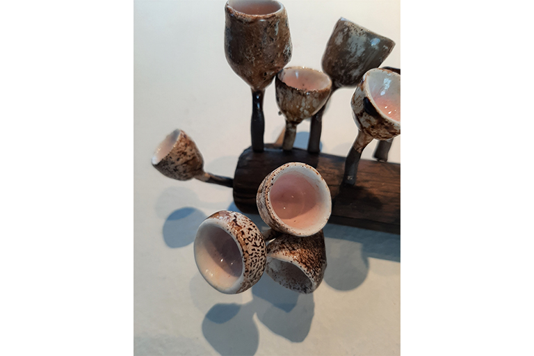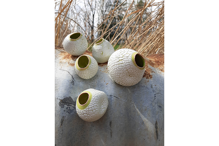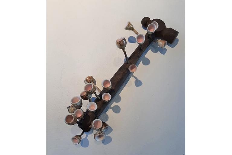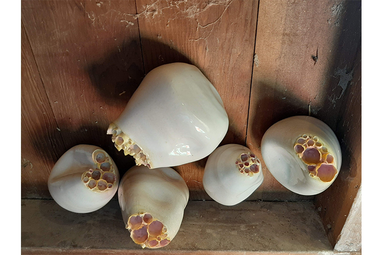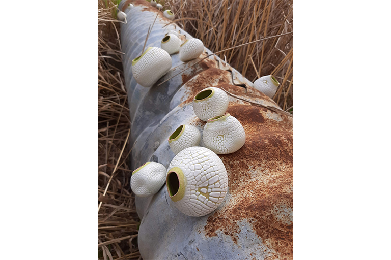 Since the first Industrial Revolution beginning in the mid-18th century, human activities have significantly altered the rest of the natural world. Other species have evolved in reaction to circumstances produced by human actions. Through my own observations of nature and research into how humans have impacted nature’s evolution, speculation began to swell as to what does the future look like? My thesis work presents found objects from human life intermingled with my own ceramic pieces that are inspired by nature but have elements of peculiarity. The relics represent a human existence and the ceramic components act as a symbol of other forms of life. These familiar, yet odd growth forms imply futurity, a continued existence. This futurity is stemming from a human element that is clearly from the past, combined with this altered view of nature. Are humans of the past too? Are these growths something of the future? At a fundamental level, the work I make as an artist is intended to imply that life will continue in some form, with or without us. My work evokes a glimpse of how things may evolve in the future in order to stress the importance of mindful consideration of how the decisions we make impact the environment.
